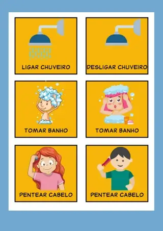 Cards com ações do cotidiano, como: tomar banho, ir ao banheiro, brincar, guardar brinquedos, lavar o rosto, assistir TV, entre outras.